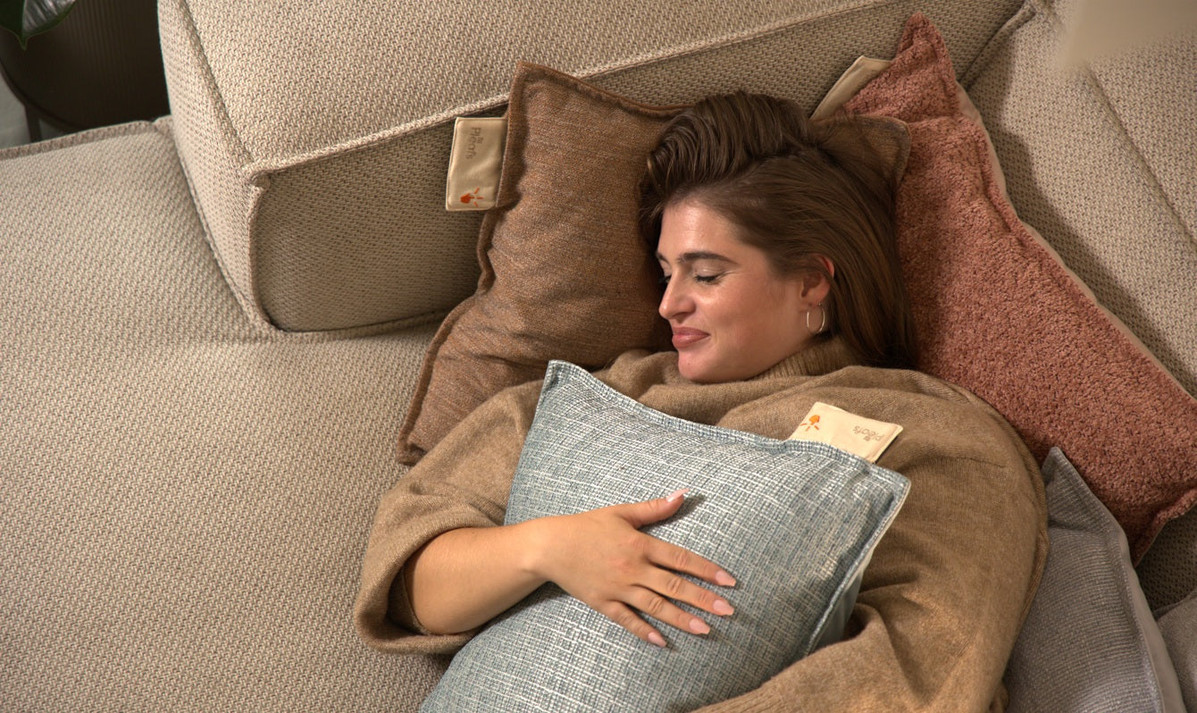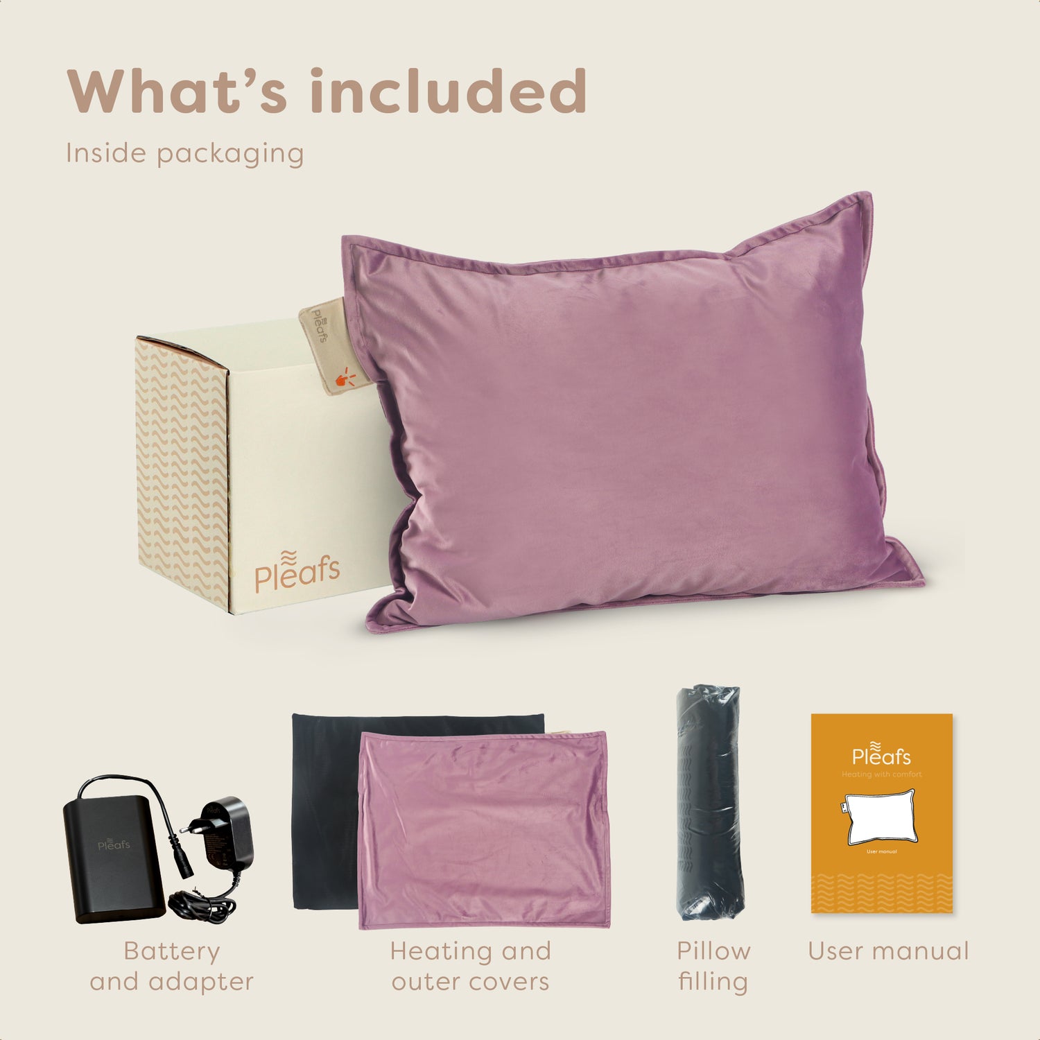 Pleafs®-lämpötyyny toimitetaan täydellisenä pakkauksena, jotta voit ottaa sen käyttöön heti. Pakkauksesta löydät lämpötyynyn päälliset, sisätyynyn, ladattavan akun, USB-C-laturin ja käyttöohjeen. Kaikki osat on valmistettu kestävistä materiaaleista, jotta voit nauttia tuotteesta pitkään.